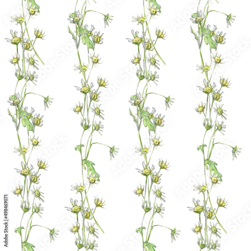 Watercolorseamless pattern with pastel small flowers chamomile drawn by hand. Doodle with stripes on a white background.