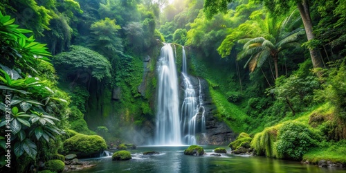 Waterfall in dense forest with lush greenery, wilderness, biodiversity, wilderness, biodiversity, natural beauty, peaceful