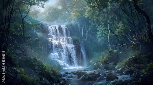 waterfall, forest, nature, water, green, tree, leaf, rock, stream, cascade, flowing, lush, foliage, vegetation, landscape, scenery, outdoors, wild, natural, beauty, calmness, serenity, peace, mist, fog, sunlight, shadow, mossy, fresh, rainforest, jungle, tropical, environment, preserve, harmony, wonder, photo, art, digital, image