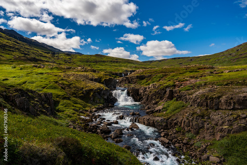 landscape, mountain, nature, river, sky, water, mountain, stream, cloud, summer, green, vale, forest, travel, grass, rock, rock, waterfall, scenery, norge, hill, tree, cloud, hill, view, island