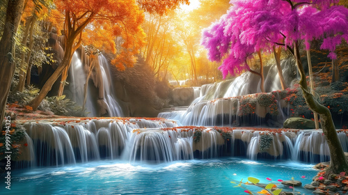 Waterfalls and flowers, beautiful landscape, magical and idyllic background with many flowers in Eden.