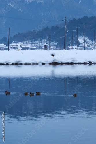 Waterfowl swimming in a cold lake in the middle of winter.