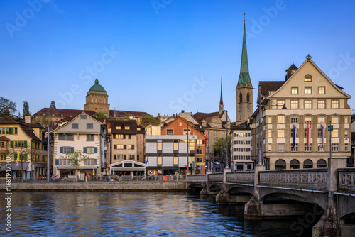 Waterfront cityscape with historic buildings on the Limmat, Zurich, Switzerland