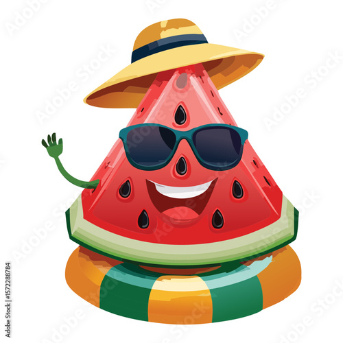 watermelon, fruit, cute, cartoon, character, summer, hat, sunglasses, waving, happy, fun, tropical, juicy, sweet, healthy, food, vacation, holiday, beach, fresh, flat, style, graphic, design, illustration, children, greeting