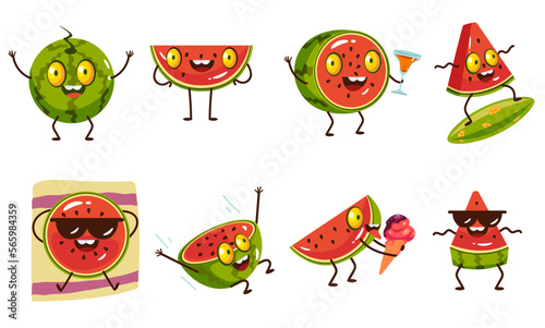 Watermelon character with sunglasses face happy fruit mascot summer concept set. Vector cartoon graphic design element illustration