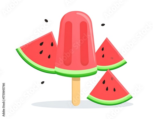 popsicle, watermelon, summer, fruit, ice, cool, sweet, refreshing, dessert, food, juicy, red, green, slice, vibrant, cute, cartoon, flat, design, delicious, treat