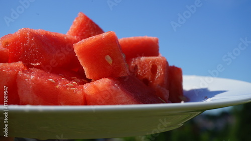 watermelon, melon, plate, water, diet, fresh, fruit, piece, red, ripe, sweet, background, food, nature, slice, summer, healthy, juicy, nourishment, organic, green, tasty, white, health, refreshing, watermelon, delicious, sliced, isolated, refreshment, bright, eating, alimentary, seed, closeup, dripped, eat, exotic, plant, section, vitamin, studio, cut, sky