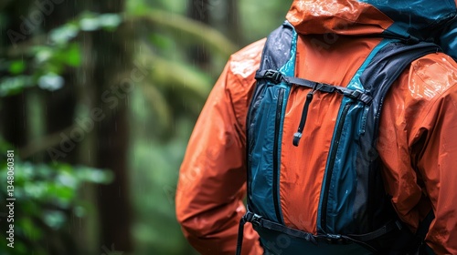 jacket, waterproof, trail, running, nature, forest, rain, adventure, sport, activity, equipment, athlete, gear, performance, fitness, environment, hiking, landscape, tree, weather, vibrant, textile, fabric, functionality, protection, design, comfort, lightweight, hard-wearing, seamless, movement, style, rugged, closeup, back, shoulder, exploration, excitement, wet, wilderness