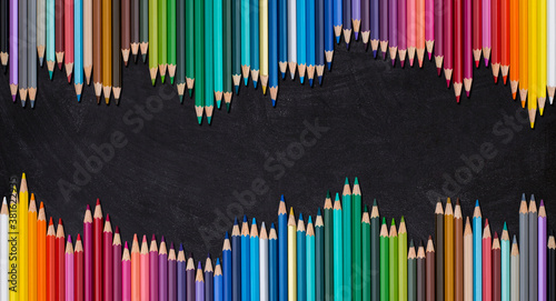 Wave border of colorful wooden pencils on a blank blackboard, back to school concept.