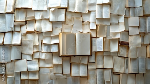 Wave of Books with Open Book on Top, A mesmerizing arrangement of books creating a wave like structure