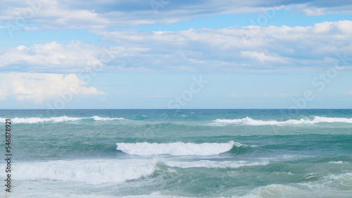 Waves surfing in the mediterranean sea. View from the beach with waves, turquoise water. Summer background.