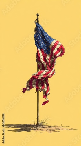 american flag, pole, yellow background, patriotism, resilience, fabric, waving, symbol, pride, daylight, outdoors, nature, freedom, democracy, nationalism, decoration, textile, wind, fluttering, standing, historical, icon, culture, heritage, flag pole, natural beauty, scenery, sunlit, stripes, star, landscape, motion, oneness, identity, celebration, imagery, storytelling
