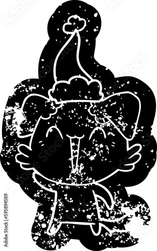 waving little dog quirky cartoon distressed icon of a wearing santa hat