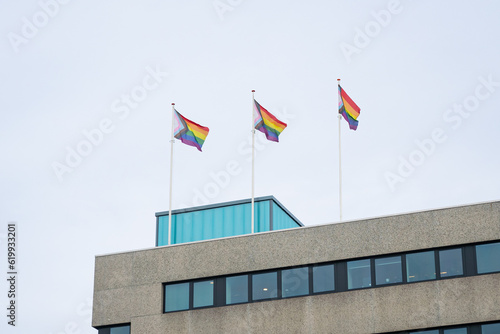 Waving transgender pride flags on the top of a building in Amsterdam, The Netherlands