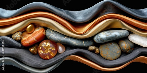 Wavy fabric and smooth stones arranged in a still life, with accents of copper and gold