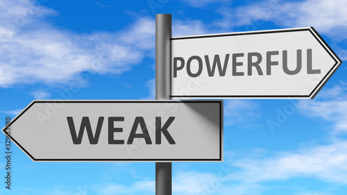 Weak and powerful as a choice - pictured as words Weak, powerful on road signs to show that when a person makes decision he can choose either Weak or powerful as an option, 3d illustration