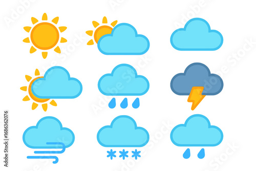 weather, icon, set, forecast, sun, cloud, rain, snow, wind, storm, thunder, climate, meteorology, symbol, vector, illustration, design, flat, cartoon, sunny, cloudy, rainy, snowy, windy, stormy, thunderstorm, sunshine, raindrop, snowflake, lightning, bolt, temperature, season, nature, element, collection, graphic, signs, simple, modern, app, web, pictogram, isolated, sky, atmosphere