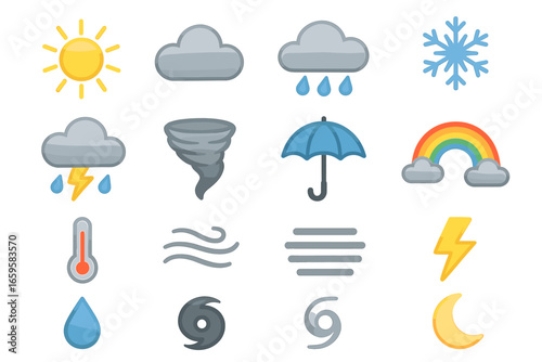 weather, icon, collection, sun, cloud, rain, storm, snowflake, wind, rainbow, umbrella, lightning, thermometer, dripped, cyclone, tornado, moon, wave, temperature, sunny, cloudy, rainy, stormy, snowy, windy, symbol, forecast, meteorology, climate, overcast, drizzle, sunshine, breezy, vector, icon