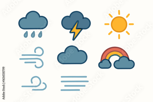 weather, icon, rain, thunder, sun, wind, cloud, rainbow, illustration, storm, sunny, overcast, breeze, stormy, forecast, element, symbol, nature, sky, atmospheric, climate, meteorology, simple, design, graphic, cartoon, temperature, pattern, set, condition, vibrant, vector, icon