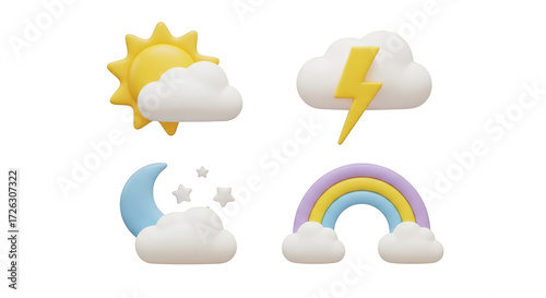 weather, icon, sun, cloud, lightning, moon, star, rainbow, forecast, meteorology, climate, sky, nature, symbol, graphic, illustration, three-dimensional, cartoon, cute, blue, yellow, white, purple, pastel
