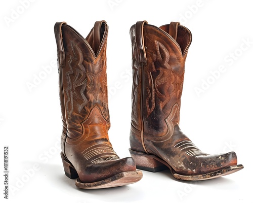 Weathered Cowboy Boots with Intricate Stitching on Isolated White Background