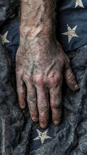 hand, texture, dirt, fabric, star, patriotism, background, skin, detail, closeup, human, cleanliness, rustic, symbol, story, history, emotion, contrast, artistry, photo, portrait, casual attire, raw, nature, artistic, abstract, vintage, hand-made, labor, strength, earth, simplicity, gesture, object, tactile