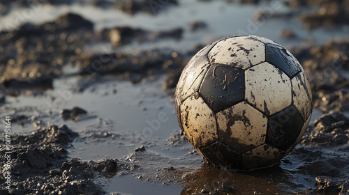 Weathered Soccer Ball in Muddy Puddle Highlighting the Raw Spirit of Outdoor Sports in Challenging Conditions