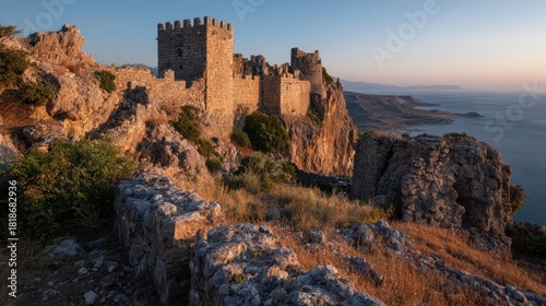castle wall, battlement, blue skies, landmark, quiet, erosion, mortar, ancient, remote, limestone, isolation, mediaeval, banal, golden hour, rugged, solitude, granite, stillness, lichen, calm, masonry, heritage, texture, seascape, exploration, stone, architectural, masonry, historical, moss, hilltop, sunlit