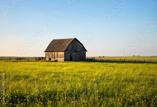 weathered, wooden, barn, rural, serene, rustic, landscape, meadow, green, wildflower, scattered, sparse, summer, sky, blue, hazy, cirrus, cloud, warm, gold, hours, light, realistic, detailed, texture, calmness, isolation, lone, countryside, agricultural, farm, idylli, peaceful, calm, natural, scenery, outdoors, daytime, sunny, photo, nature