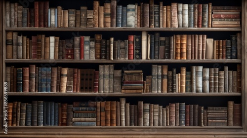 weathered wooden bookshelf filled with classic novels, its shelves overflowing with stories waiting to be discovered.