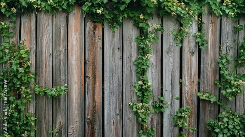 Weathered wooden fence panels with climbing green ivy vines creating natural garden barrier pattern