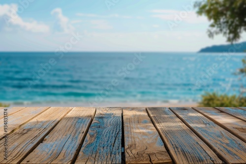Weathered Wooden Plank Surface with a Blurred Beach Scene Background