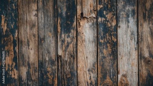 Weathered wooden planks with an aged texture displaying natural cracks and peeling paint in a rustic background setting