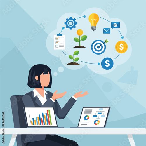 businesswoman, growth, finance, planning, investment, strategy, target, process, management, success, chart, graph, laptop, desk, office, career, illustration, icon, workflow, development, analysis, money, goal, organisation, cloud, thinking, diagram, presentation, visualisation, business