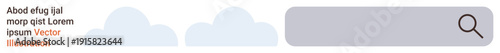 Web design, online browsing, search engines, information retrieval, internet navigation, user interface concepts. Search bar with magnifying glass icon and light cloud elements. Web design and online