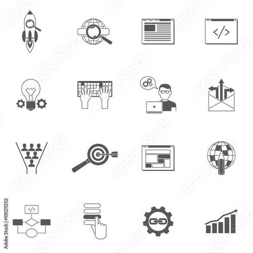 coding, programming, management, development, setting, chart, chat, electronic mail, idea, magnifying, glasses, message, business, icon, set, cyberspace, collection, pictogram, signs, symbol, computer, mobile, phone, website, web, site, technology, user, interface, element, design, network, media, marketing, wireless, communication, guide, search, navigation, support, content, layout, app, application, illustration, isolated, flat, black