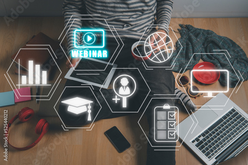 Webinar e-learning training business internet technology concept. Person hand using digital tablet with VR screen webinar icon on office desk.