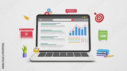 Website SEO ranking, content promotion, search engine optimization, on page ads, improve search result ranking, drive organic traffic. Website ranking and SEO on a 3D laptop