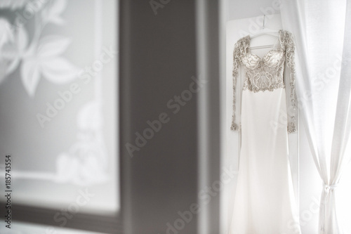 dress, clothing, wedding, beautiful, bridal, bride, clothes, white, hanger, marriage, design, elegance, lace, style, hanging, day, fashion, home, light, pretty, interior, ready, traditional, elegant, room, modern, preparation, fabric, satin, clothes rack, engagement, romance, romantic, symbol, decoration, strapless, classic, commitment, detail, garment, beauty, female, ivory, long, indoor, nobody, wall, window, door