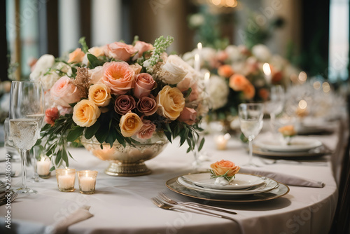 wedding, table, bouquet, decoration, flower, eatery, dinner, food, flower, glasses, celebration, party, rose, setting, plate, pink, arrangement, event, banquet, decor, meal, reception, rose, luxury, floral