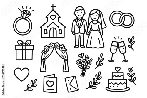 wedding, icon, set, marriage, love, vector, illustration, ceremony, hand-drawn, doodle, outline, bride, groom, couple, church, ring, cake, celebrate, party, engagement, romance, symbol, nubes, invitation, gift, honeymooners, design, element, decoration, simple, line art, black-and-white, vignetting, flower, bouquet, champaign, arch, cartoon, human relationships, valentine