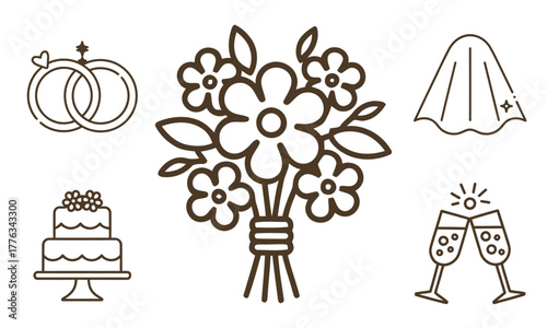 wedding, love, marriage, couple, ring, bouquet, cake, champaign, celebration, romance, event, flower, nubes, bridal, ceremony, anniversary, symbol, design, illustration, vector, line, icon, outline, romantic, happiness, elegant, invitation, decor, festive, union, bride, groom, joy, decoration, graphic, minimalist