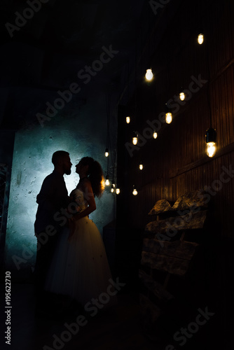 Wedding in the style of rock. Rocker or Biker wedding. Guys with stylish leather jackets. It's a rock'n'roll baby. Sweet couple in a photo studio. Steep shooting in a wooden location. Around the bulb