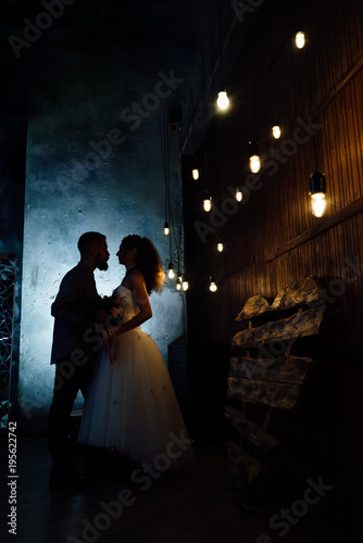 Wedding in the style of rock. Rocker or Biker wedding. Guys with stylish leather jackets. It's a rock'n'roll baby. Sweet couple in a photo studio. Steep shooting in a wooden location. Around the bulb