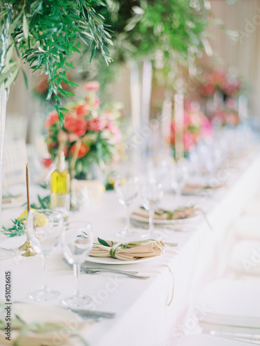 arrangement, blossom, candle, cutlery, decor, decoration, dining table, dish, crockery, elegant, flower, floral arrangement, glasses, goblet, greenery, home decor, indoor, interior design, leaf, reception, room, stylish, table, tablecloth, tableware, vase, wedding