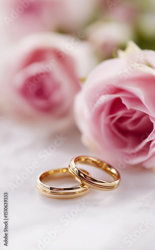 wedding rings and pink roses