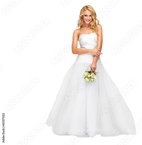 Wedding, smile and flowers with portrait of woman on png for beauty, marriage and celebration. Happy, love and roses with bride isolated on transparent background for makeup, cosmetics and event