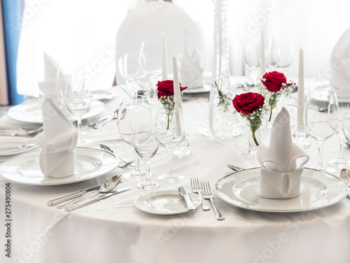 table, eatery, dinner, wedding, glasses, setting, banquet, party, plate, white, dining, napkin, decoration, wine, food, catering, celebration, tablecloth, luxury, place, knife, reception, fork, lunch, event, elegant, holiday, meal, interior, silver, arrangement