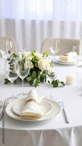 table, wedding, eatery, dinner, setting, glasses, decoration, plate, party, banquet, celebration, reception, catering, food, napkin, event, dining, fork, knife, cutlery, wine, tablecloth, flower, luxury, silverware