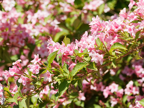 Weigela florida. Blooming bush. Buds and bell-shaped flowers in highbush with dark pink corolla on arching branches covered of green-bronze foliage swaying in wind